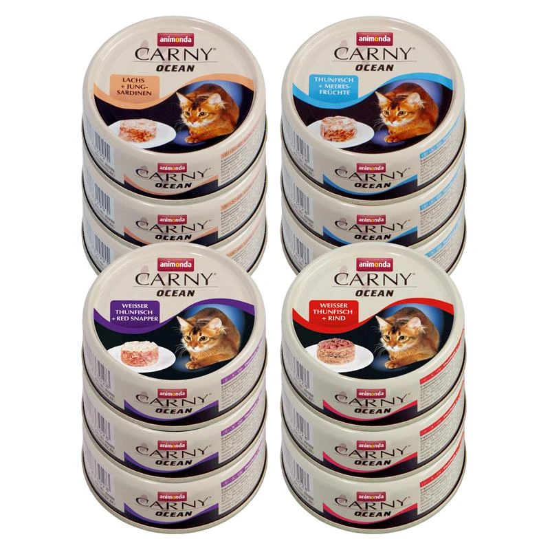 Thunfisch+Meeresfrüchte: Thunfisch (48 %), Brühe, Shrimps + Calamari (6 %)