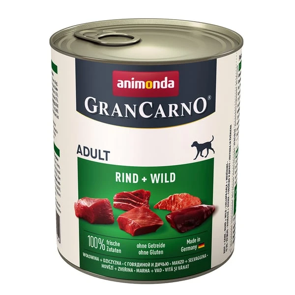 Entdecke proteinreiches Nassfutter für deinen Hund. Animonda Hunde-Nassfutter GranCarno Adult Rind und Wild überzeugt als qualitativ hochwertiges Futter. Kleine Feinschmecker werden mit dem leckeren Rind voll auf ihre Kosten kommen. Das Futter ist für Hunde aller Größen geeignet und speziell auf die Bedürfnisse von ausgewachsenen Hunden angepasst. Um den Eiweiß- und Energiebedarf deines Hundes abzudecken, eignet sich vor allem dieses proteinreiche Hundefutter. Hochwertiges Protein liefert das enthaltene Herz. Ein vitales und starkes Hundeleben wird durch die beigefügten Vitamine begünstigt. Das ausgewogenes Calcium-Phosphor-Verhältnis kann positive Effekte auf den Knochenaufbau und den Erhalt gesunder Knochen haben. Verzichtet wird auf die Zugabe von Farbstoffen.