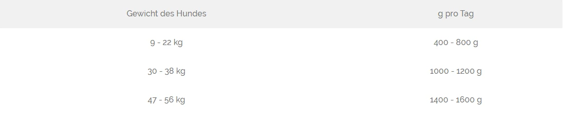 Protein 11%, Fettgehalt 8%, Rohfaser 0,5 %, Rohasche 2,5 %, Feuchtigkeit 75 %.