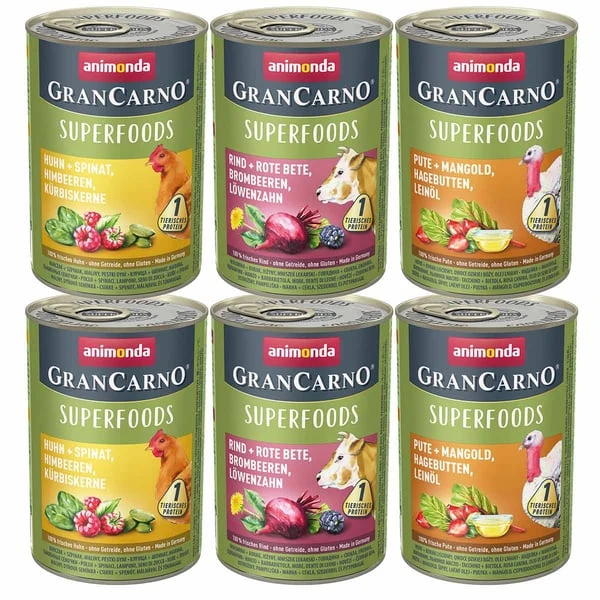 GranCarno® Superfoods steht für ausgewogene, leckere, gesunde Ernährung – mit natürlichen Superfoods und jeweils nur einer tierischen Proteinquelle – für ausgewachsene Hunde von 1 – 6 Jahren. Superfoods besitzen ein Plus an besonderen Nährstoffen, z. B. sekundäre Pflanzenstoffe, Antioxidantien, Mineralstoffe oder Spurenelemente und können so zum Wohlbefinden des Hundes beitragen. Die ausgewählten, frischen fleischlichen Rohstoffe garantieren den unvergleichlichen Geschmack, den Hunde so sehr schätzen.