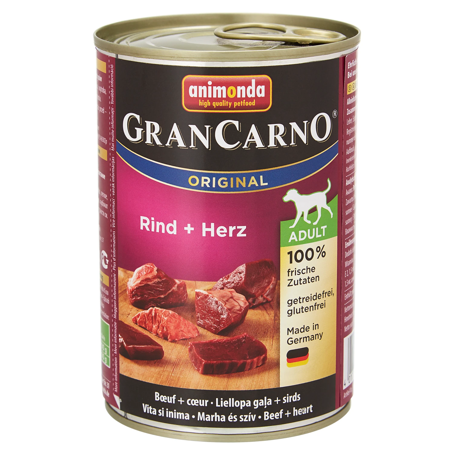 Speziell auf die Bedürfnisse von ausgewachsenen Hunden ausgerichtet, liefert das Hundenassfutter „Gran Carno“ Original der Marke Animonda alle wichtigen Nährstoffe für ein gesundes Leben. Die Rezeptur enthält zartes Rindfleisch, das mit Herzstückchen verfeinert ist. Dank des Verzichts auf Soja bzw. Getreide eignet sich das Alleinfuttermittel für sensible Hunde. Je nach Gewicht liegt die Fütterungsempfehlung bei 1 bis 2 Dosen.