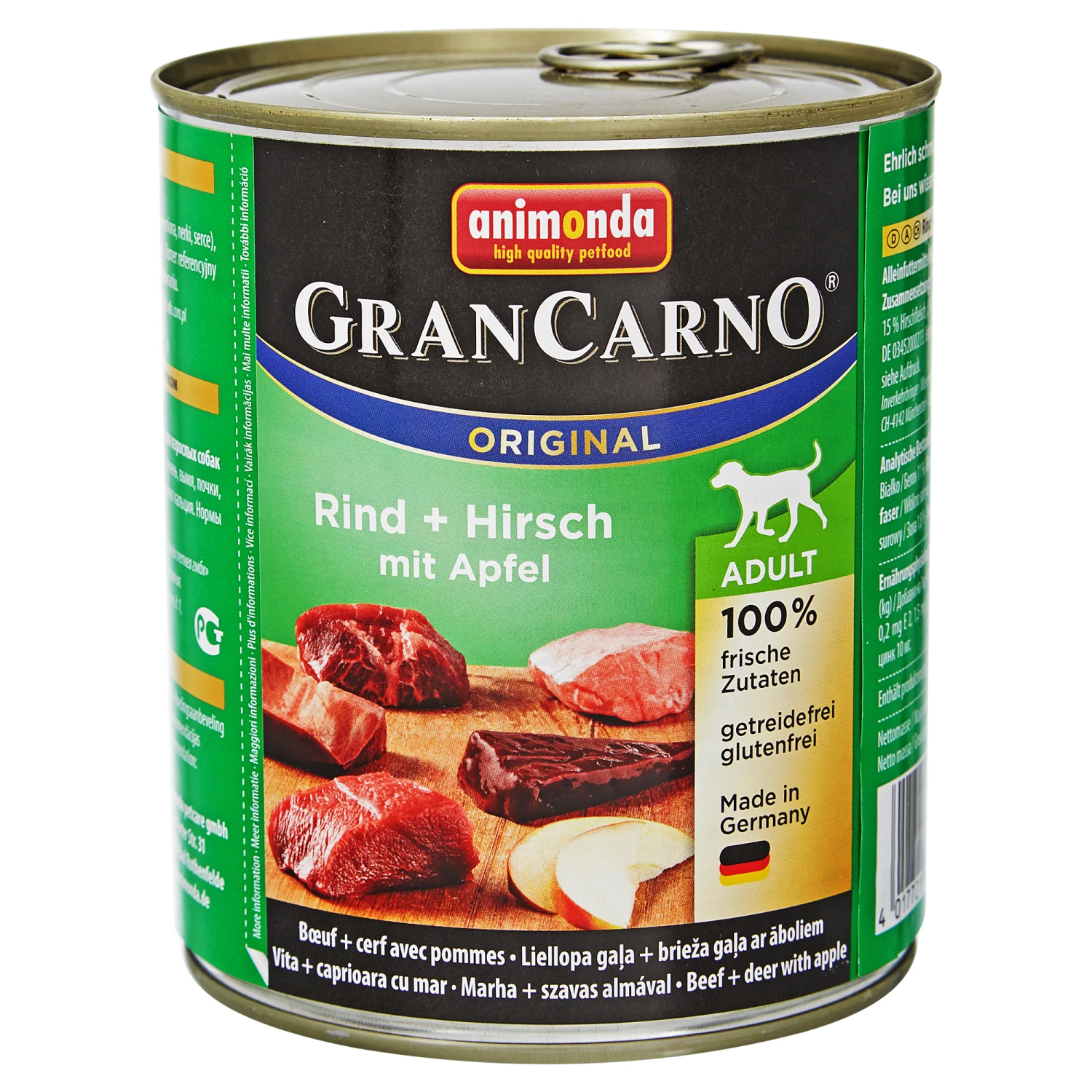 Das Hundenassfutter „Gran Carno“ Original von Animonda mit Rind, Hirsch und Apfel ist ideal geeignet für ausgewachsene Hunde. Es wird aus frischem Fleisch zubereitet. Bei der Herstellung wird auf Getreide, Soja, künstliche Farbstoffe und Konservierungsstoffe verzichtet. Der Inhalt der 800-g-Dose ist als Alleinfuttermittel verwendbar. Sie finden wichtige Hinweise für den Tagesbedarf Ihres Hundes als Aufdruck auf der Dose.
