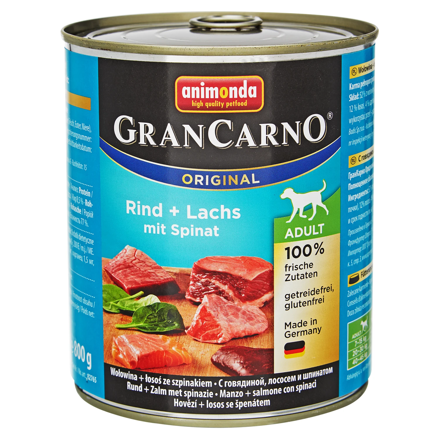 Im Hundenassfutter „Gran Carno“ Original von Animonda sind neben Rind auch Lachs und Spinat verarbeitet. Alles wird aus frischen Zutaten hergestellt und auf die Bedürfnisse von Hunden abgestimmt. Auch Ihr vierbeiniger Liebling wird sich über dieses Futter freuen. Sie können das Futter in der 800-g-Dose als Alleinfuttermittel verwenden. Fütterungsempfehlungen können Sie dem Dosenaufdruck entnehmen.