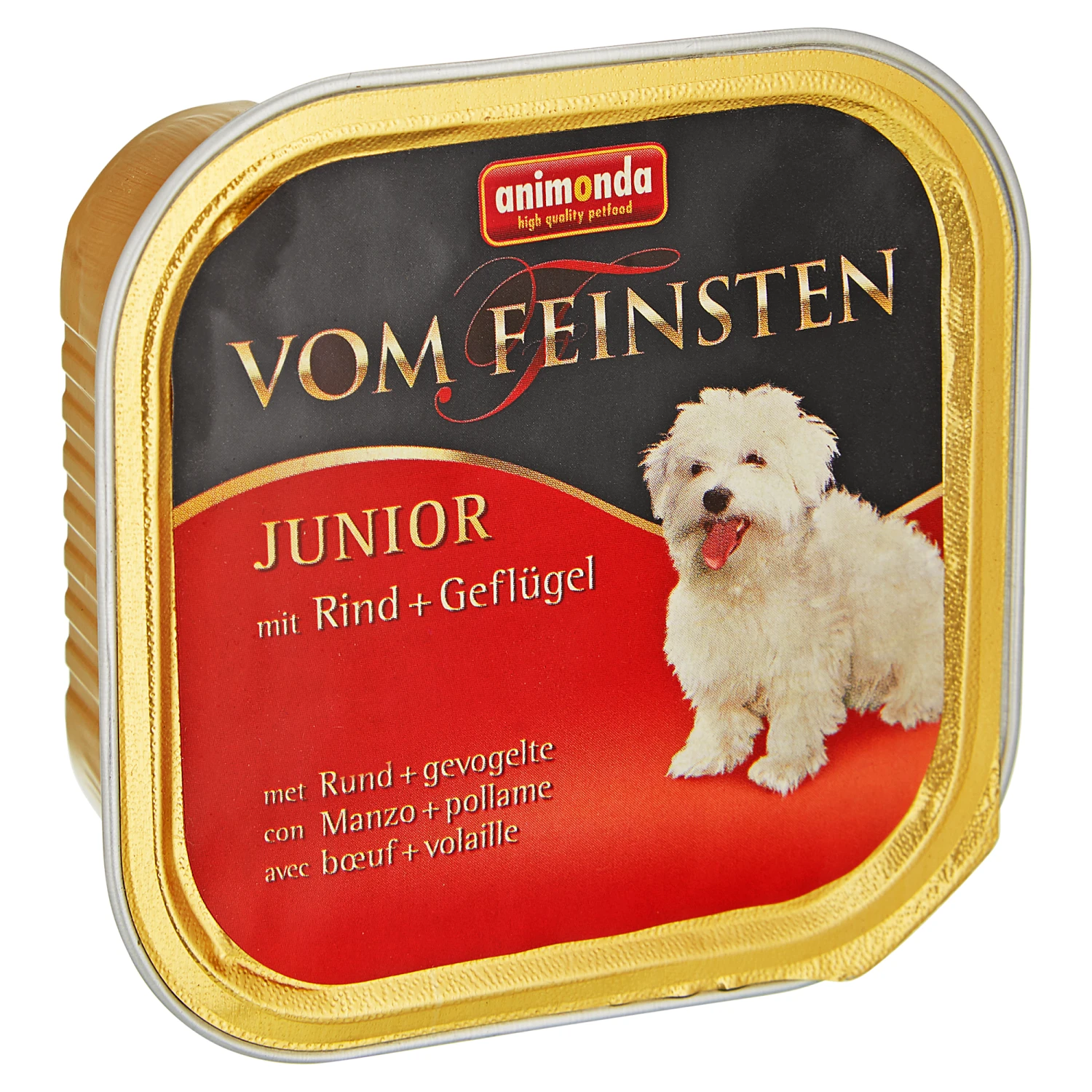 Fördern Sie die Entwicklung und Vitalität von Hundewelpen, indem Sie das Hundenassfutter „Vom Feinsten“ Junior der Marke Animonda bei der täglichen Fütterung verwenden. Die Rezeptur verwöhnt nicht nur den Gaumen des Vierbeiners, sondern versorgt den Welpen auch mit wichtigen Vitaminen und Mineralstoffen. Diese Sorte überzeugt geschmacklich mit saftigem Rind- und Geflügelfleisch.