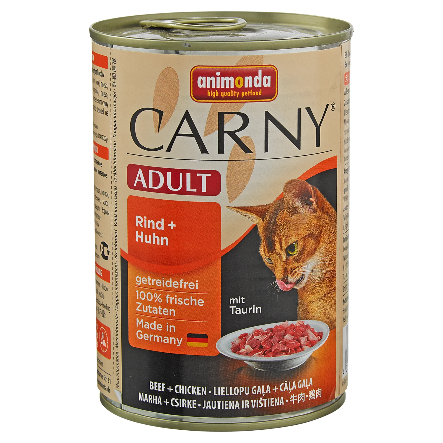 Das herzhafte Nassfutter „Carny“ Adult der Marke Animonda ist für erwachsene Katzen ideal geeignet und bietet dank frischer Zutaten einen optimalen Geschmack. Es enthält leckeres Rind (35 %) und Huhn (30 %), wodurch der Bedarf Ihrer Katze an Nährstoffen bestens gedeckt wird. Das Alleinfuttermittel enthält natürliches Taurin und ist frei von Getreide.