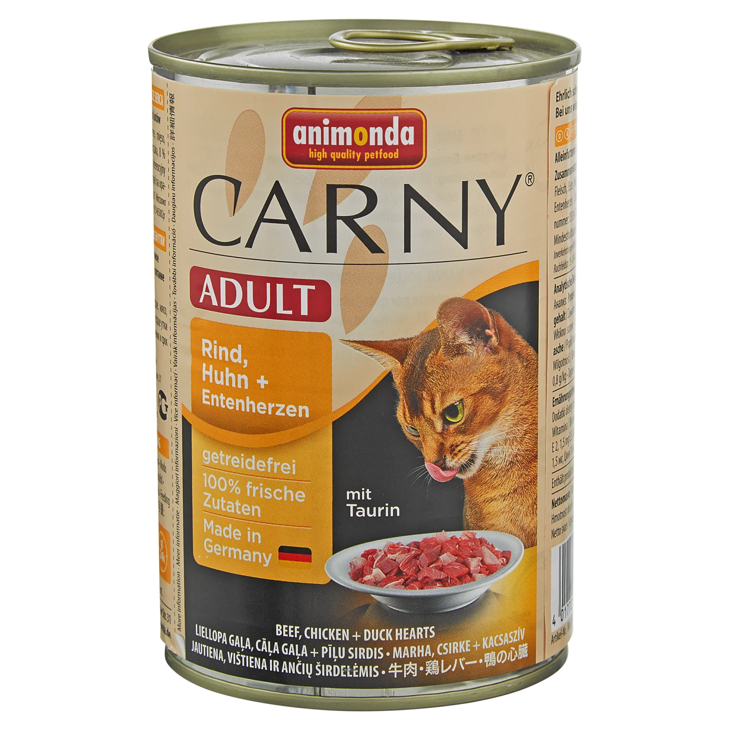 Leckeres Rind, Huhn und schmackhafte Entenherzen sorgen im Nassfutter „Carny“ Adult von Animonda für einen saftigen, natürlichen Geschmack und versorgen erwachsene Katzen mit allen wichtigen Nährstoffen. Es wird in einer 400-g-Dose geliefert und enthält natürliches Taurin. Das Futter ist aus frischen Zutaten hergestellt und getreidefrei. Es ist für Katzen ab dem 1. Lebensjahr konzipiert und ideal für die tägliche Fütterung geeignet.