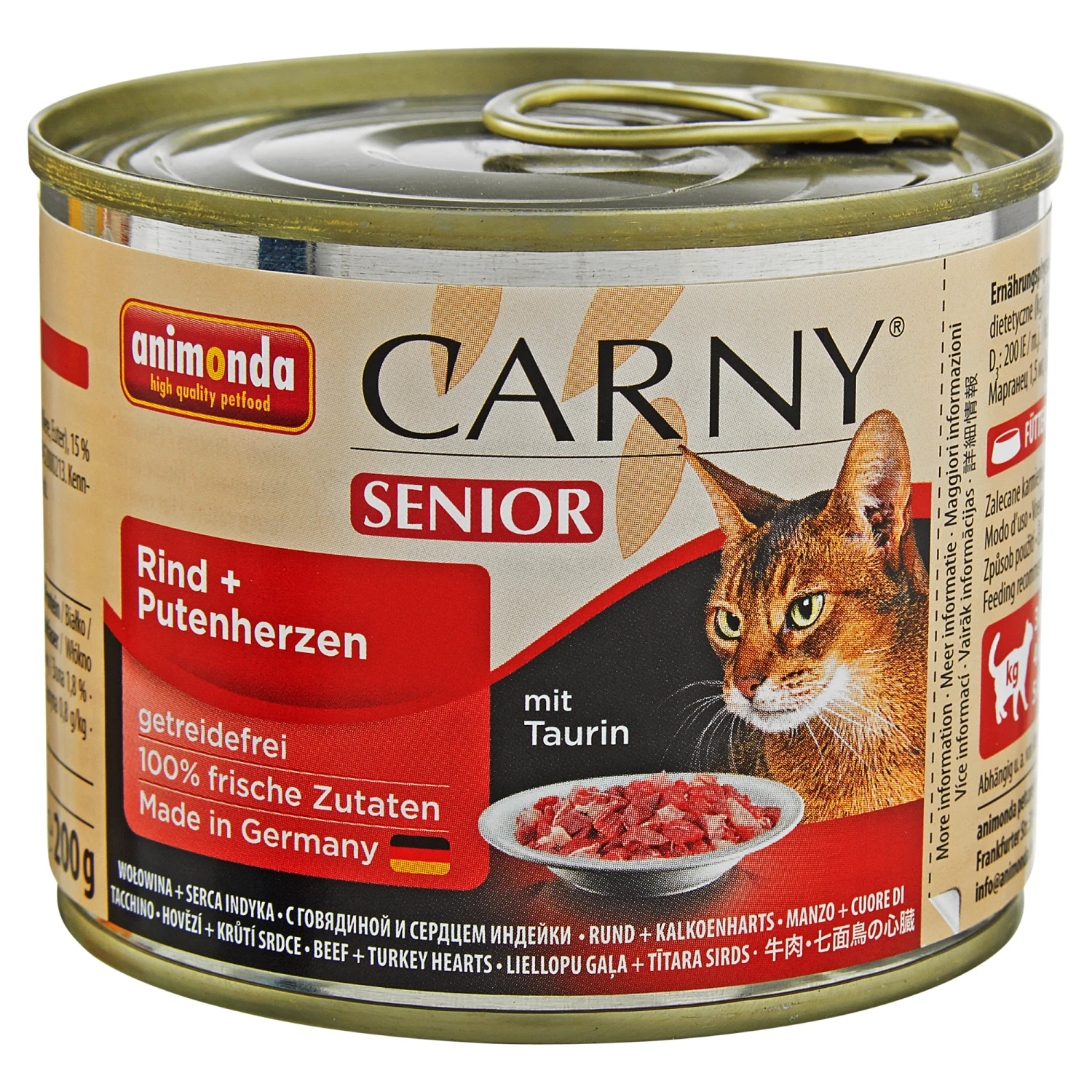 Das saftige Nassfutter „Carny“ Senior von Animonda ist speziell auf die Bedürfnisse von älteren Katzen ab 7 Jahren zugeschnitten und enthält hochwertiges Fleisch. Es besteht aus garantiert frischen Zutaten und bietet den unverwechselbaren Geschmack von Rind und Putenherzen. Das Alleinfuttermittel ist getreidefrei und enthält neben natürlichem Taurin auch alle wichtigen Nährstoffe für Ihr Tier. Es wird in einer Dose mit 200 g Inhalt geliefert.