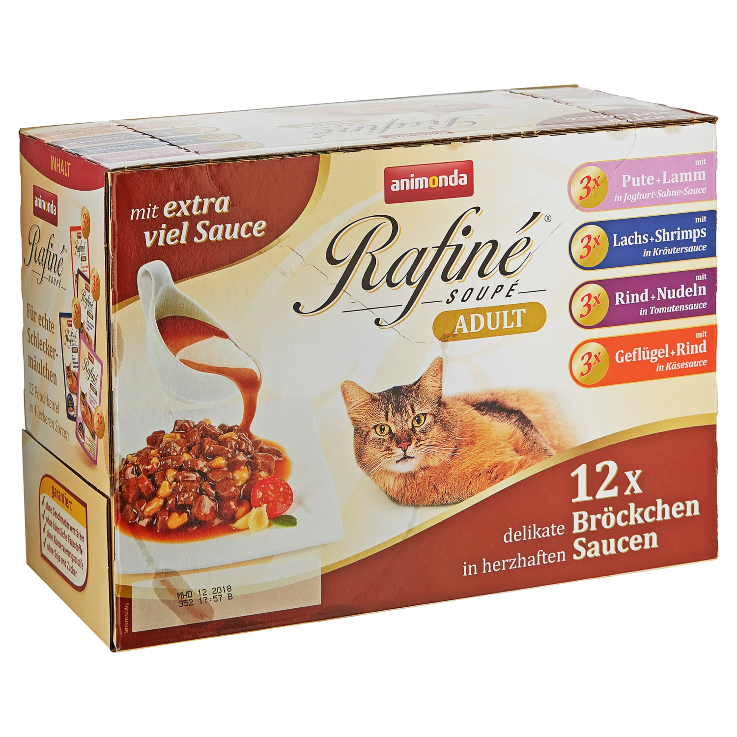 Mit dem köstlichen Nassfutter „Rafiné“ Soupé Adult von Animonda erhält Ihre Katze eine abwechslungsreiche und hochwertige Mahlzeit, die mit besonders viel Sauce überzeugt. Das Zwölferpack enthält insgesamt vier verschiedene Sorten, die der Langeweile im Napf vorbeugen und im praktischen Frischebeutel geliefert werden. Das Nassfutter ist für ausgewachsene Tiere geeignet. Die enthaltenen Sorten sind: – 3x Pute & Lamm in Joghurt-Sahne-Sauce – 3x Lachs & Shrimps in Kräutersauce – 3x Rind & Nudeln in Tomatensauce – 3x Geflügel & Rind in Käsesauce