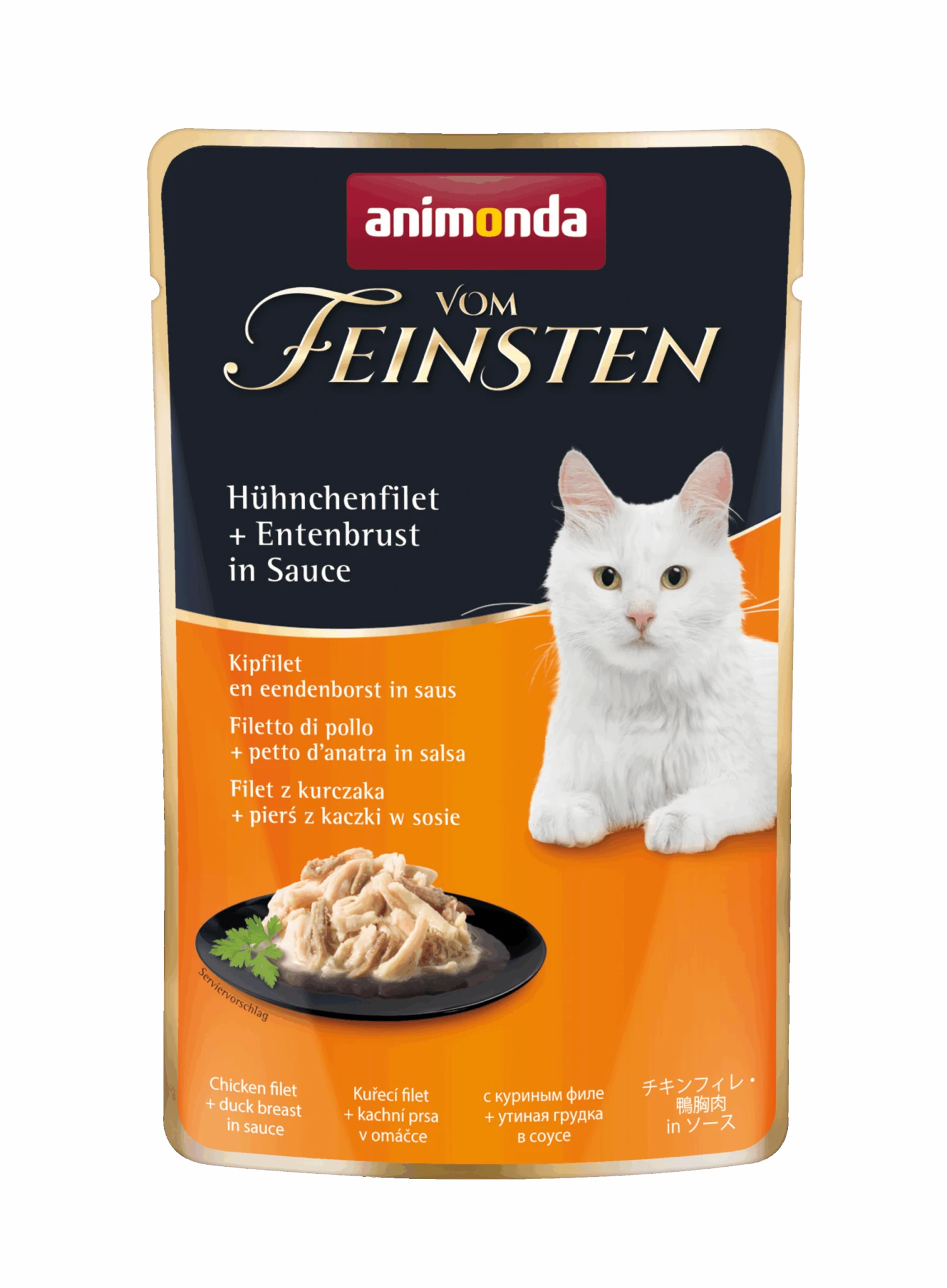 Feinstes Hühnchenfilet mit Entenbrust in Sauce für Ihre ausgewachsene Katze. Alleinfuttermittel mit erlesenen Zutaten im praktischen Pouchbeutel.