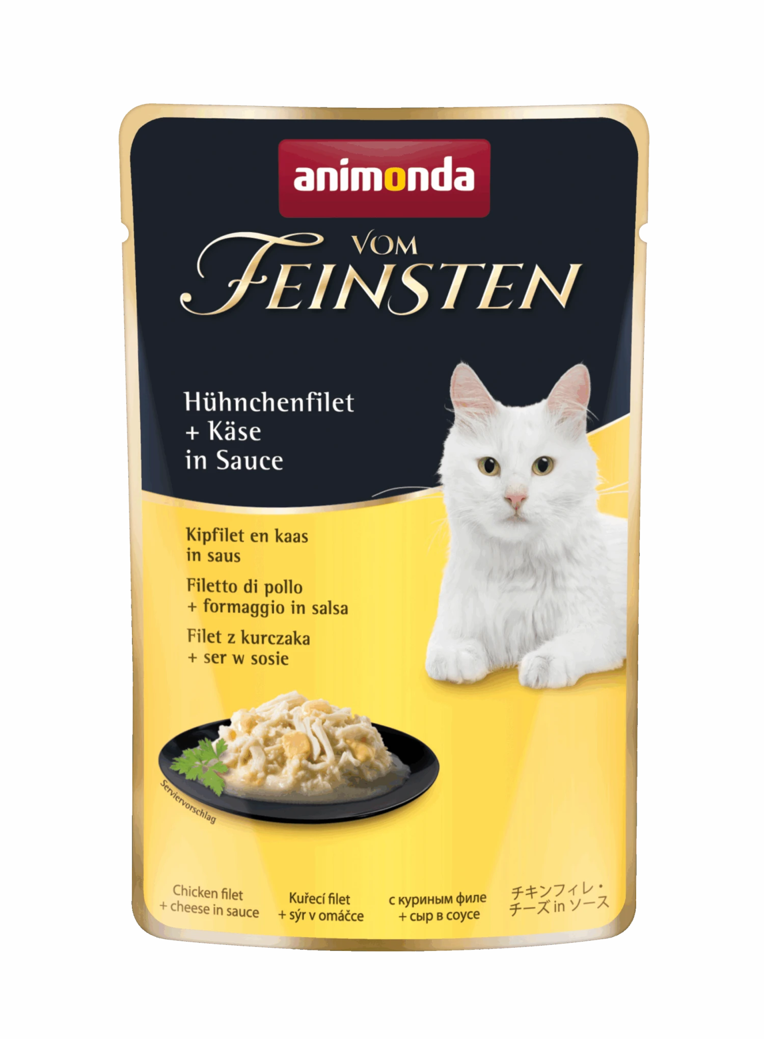 Feinstes Hühnchenfilet mit zart schmelzendem Käse. Nassfutter als Alleinfuttermittel für Ihre Katze.