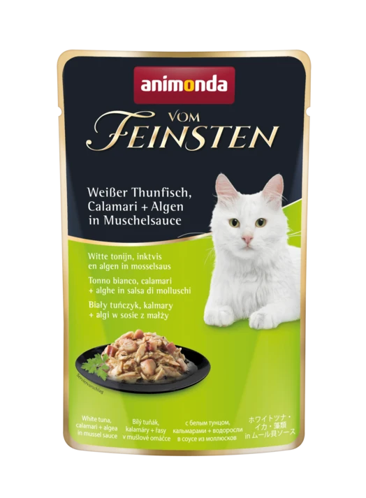 Filet vom weissen Thunfisch kombiniert mit Calamari und Algen in einer cremigen Muschelsauce. Feinstes Nassfutter als Alleinfuttermittel für ausgewachsene Katzen.