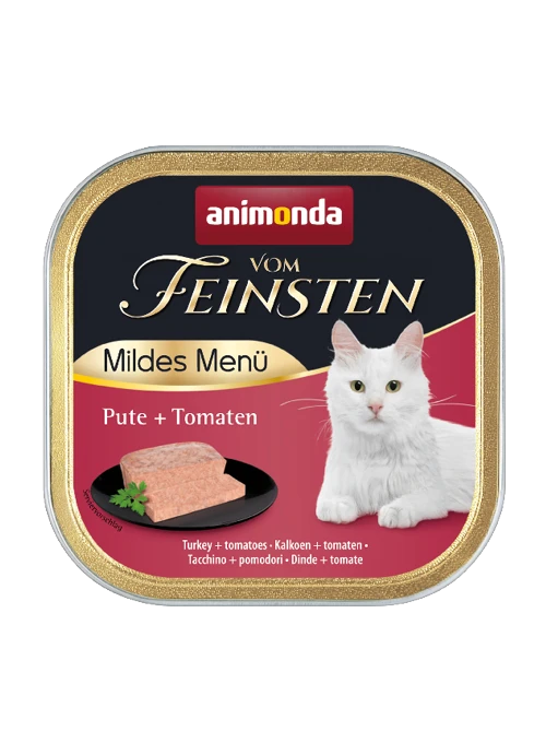 Vom Feinsten Adult Mildes Menü steht für ausgewogene, leckere gesunde Ernährung auf höchstem Niveau für ausgewachsene Katzen von 1 – 6 Jahren. Leckere Rezepturen ausschließlich aus hoch verdaulichem Putenfleisch – ohne Innereien und Leber – bieten Katzen einen besonderen Genuss. Die fein-stückigen Pasteten versorgen die ausgewachsene Katze mit allen lebenswichtigen Nährstoffen.